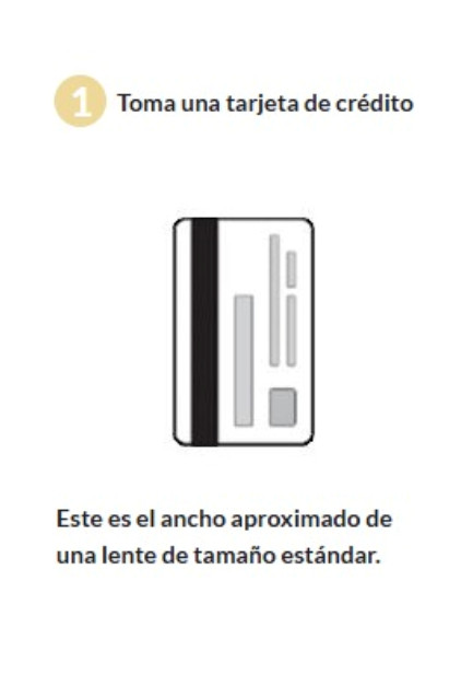 La tarjeta de crédito tiene el ancho aproximado de una lente estándar. Colocala en posición vertical para comparar visualmente el ancho de la lente en tus gafas actuales o como referencia para probar modelos.